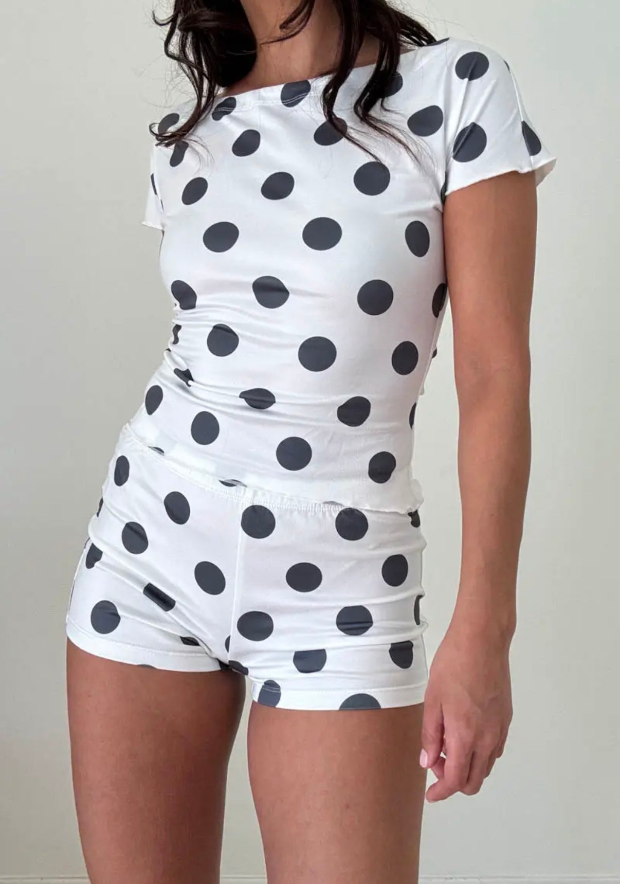 Our Bardot set is a modern spin on a retro favorite. She is a two-piece black and white polka dot set featuring a subtle off the shoulder top and mini shorts. Pair her with your fav summer flip flops or your best kitten heels and be ready to lounge or live in style.