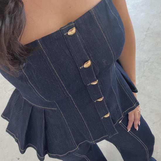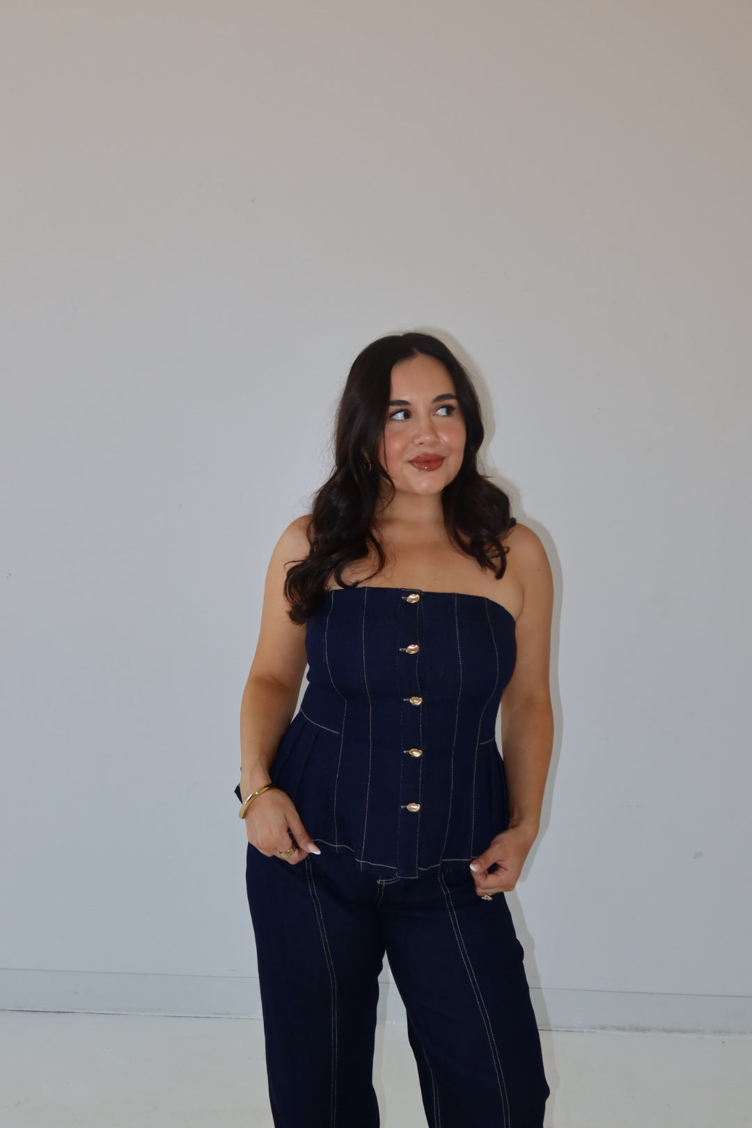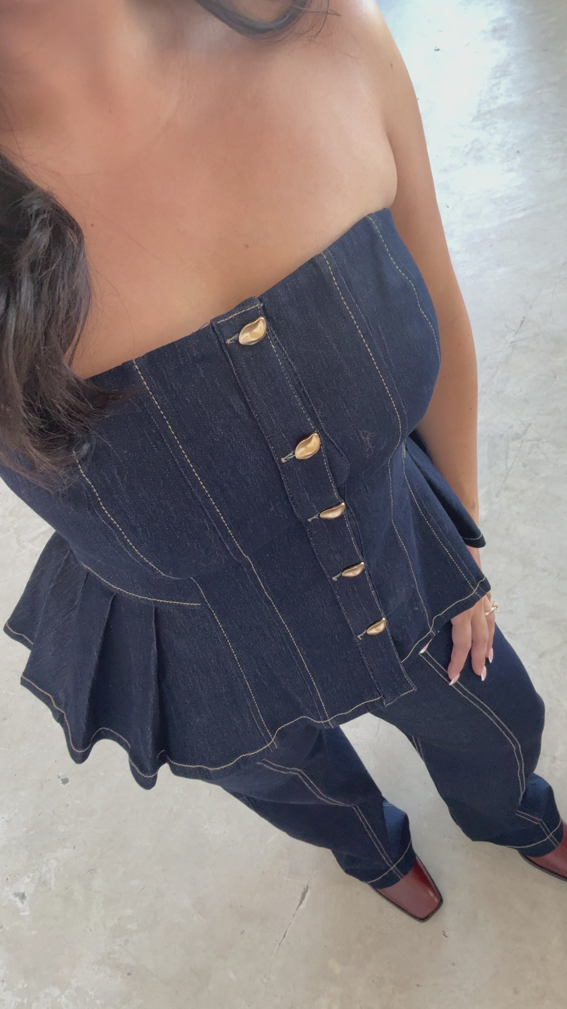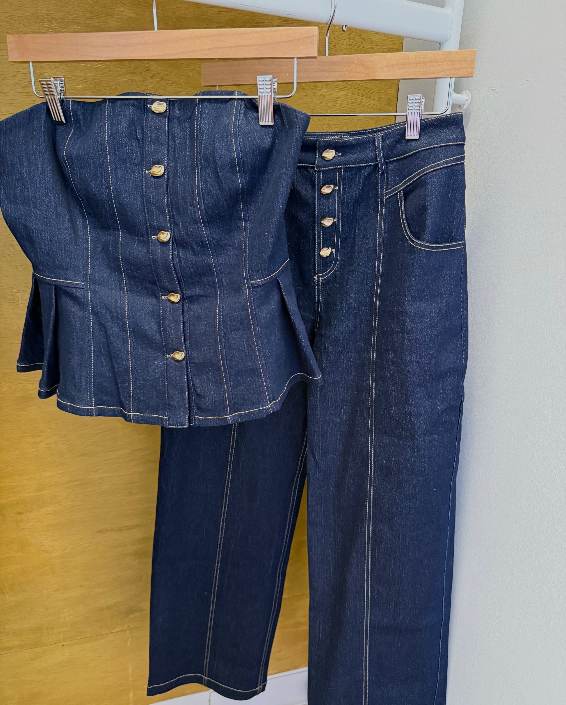 Our Chelsea Set is a two-piece stretch denim set with gorgeous gold buttons on the top and bottoms. Pair her with your best fall boots, wear her together or separately.. she's versatile!