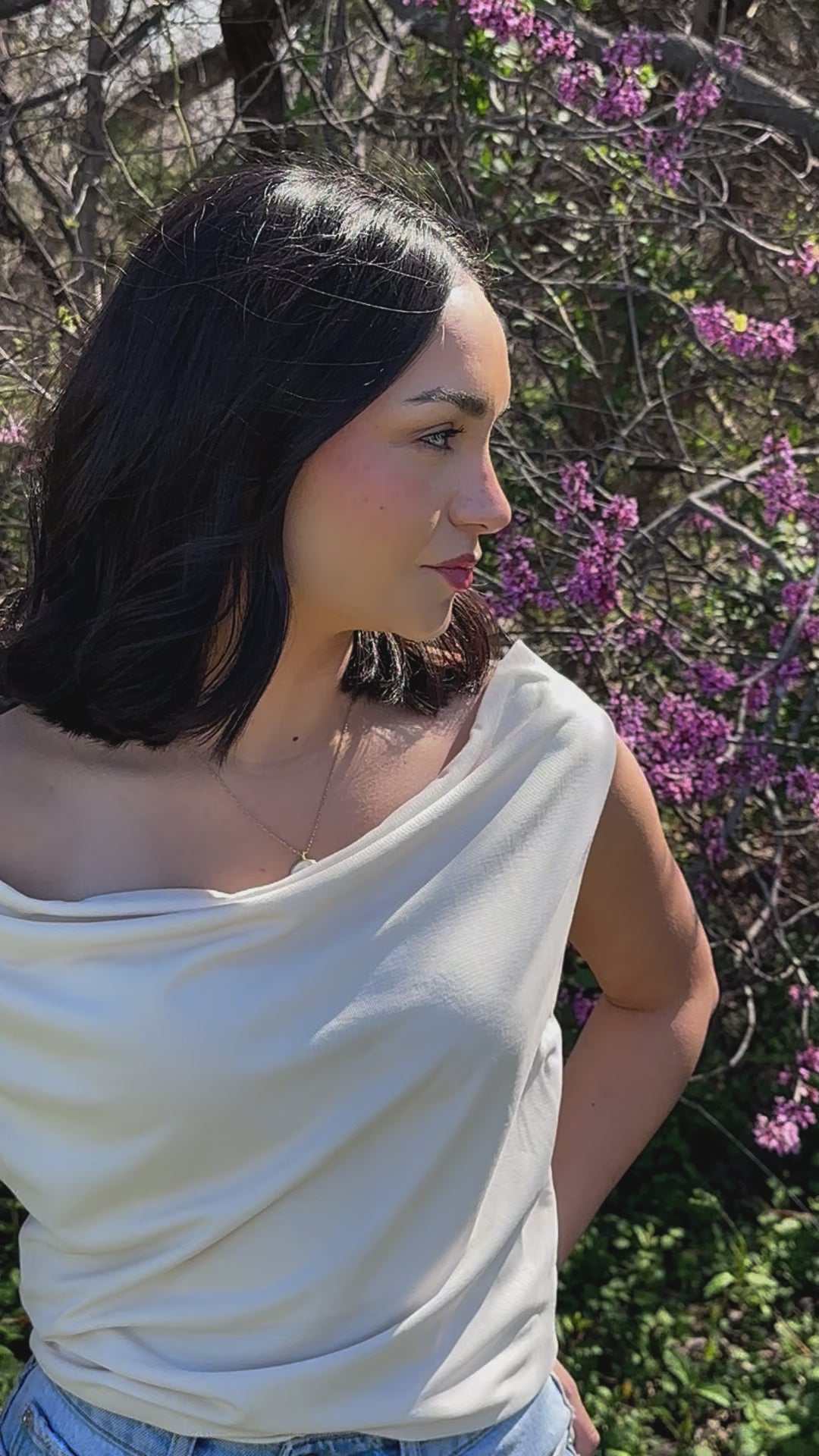 Our Dahlia top is a gorgeous off-the shoulder, cream-colored top. Pairs well with your best jeans and a glass of white wine on a patio, of course.