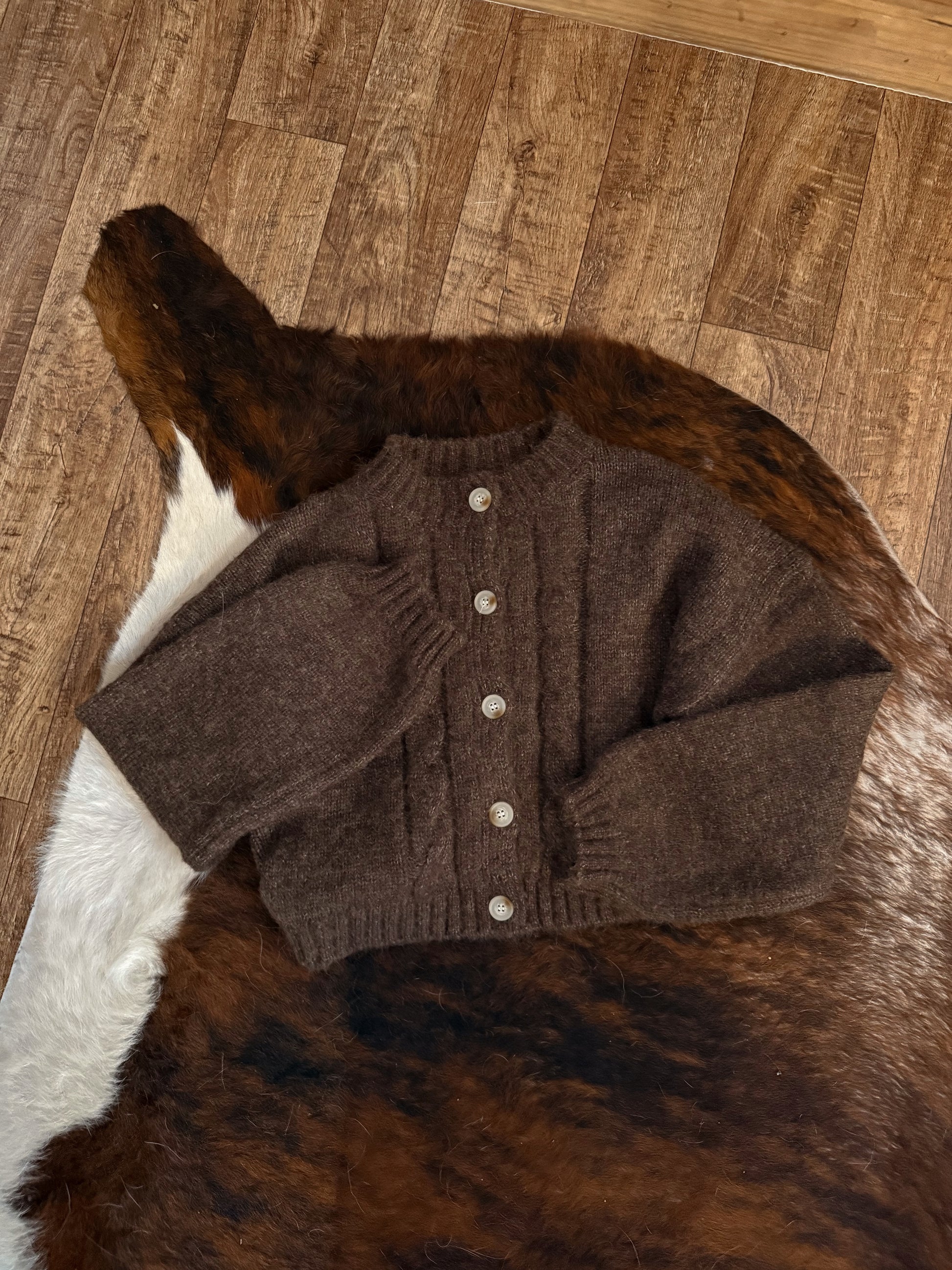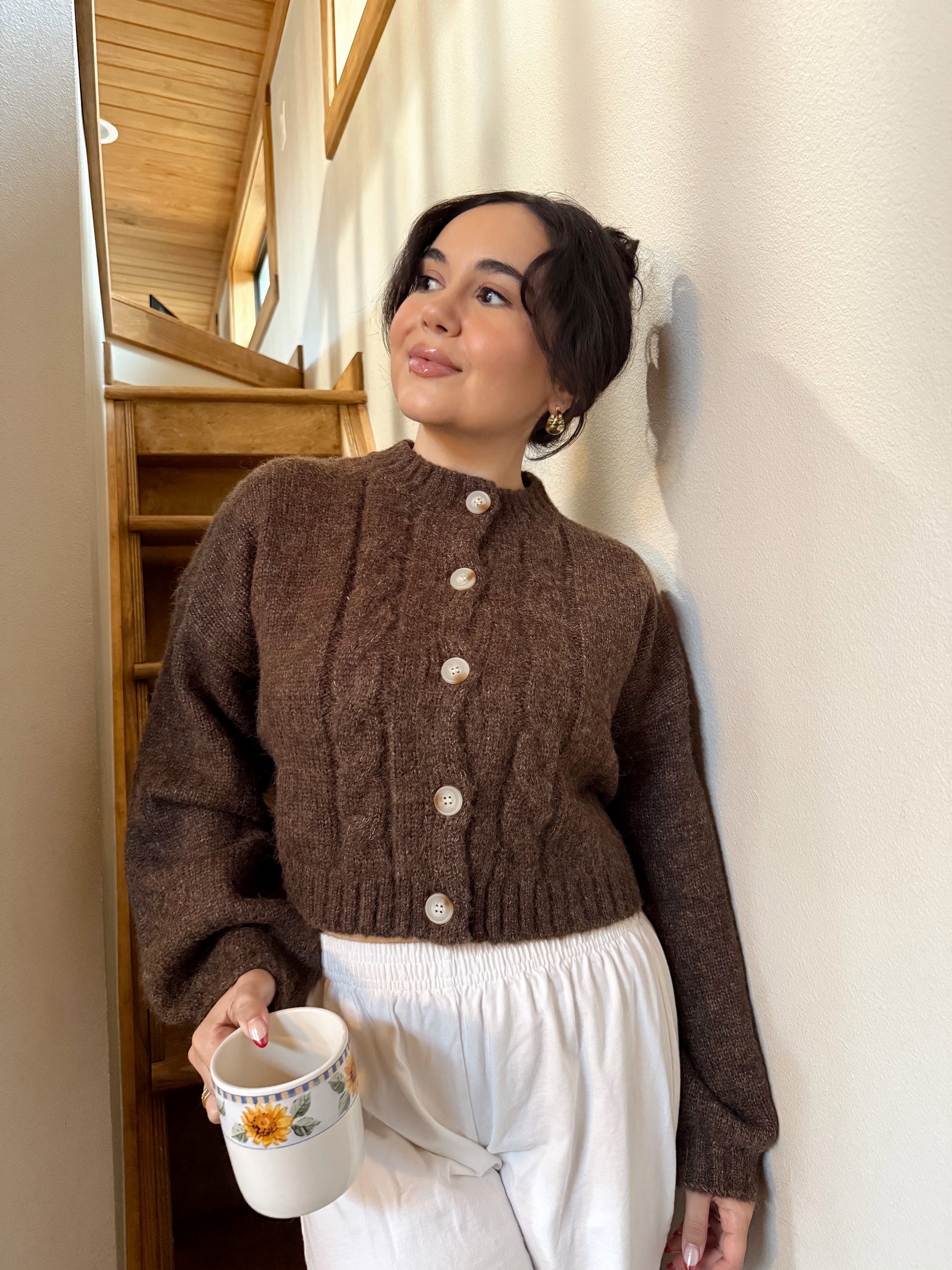 You loved our Bordeaux sweater so much, we bought her back in brown. The coziest cardigan features a cropped fit, cream buttons, and a slight balloon sleeve feel.