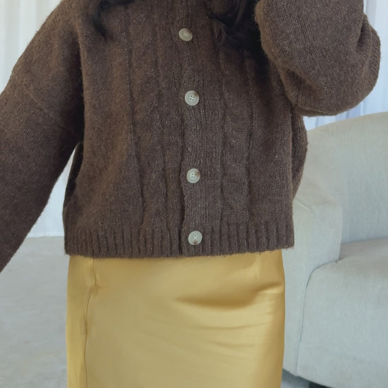 You loved our Bordeaux sweater so much, we bought her back in brown. The coziest cardigan features a cropped fit, cream buttons, and a slight balloon sleeve feel.