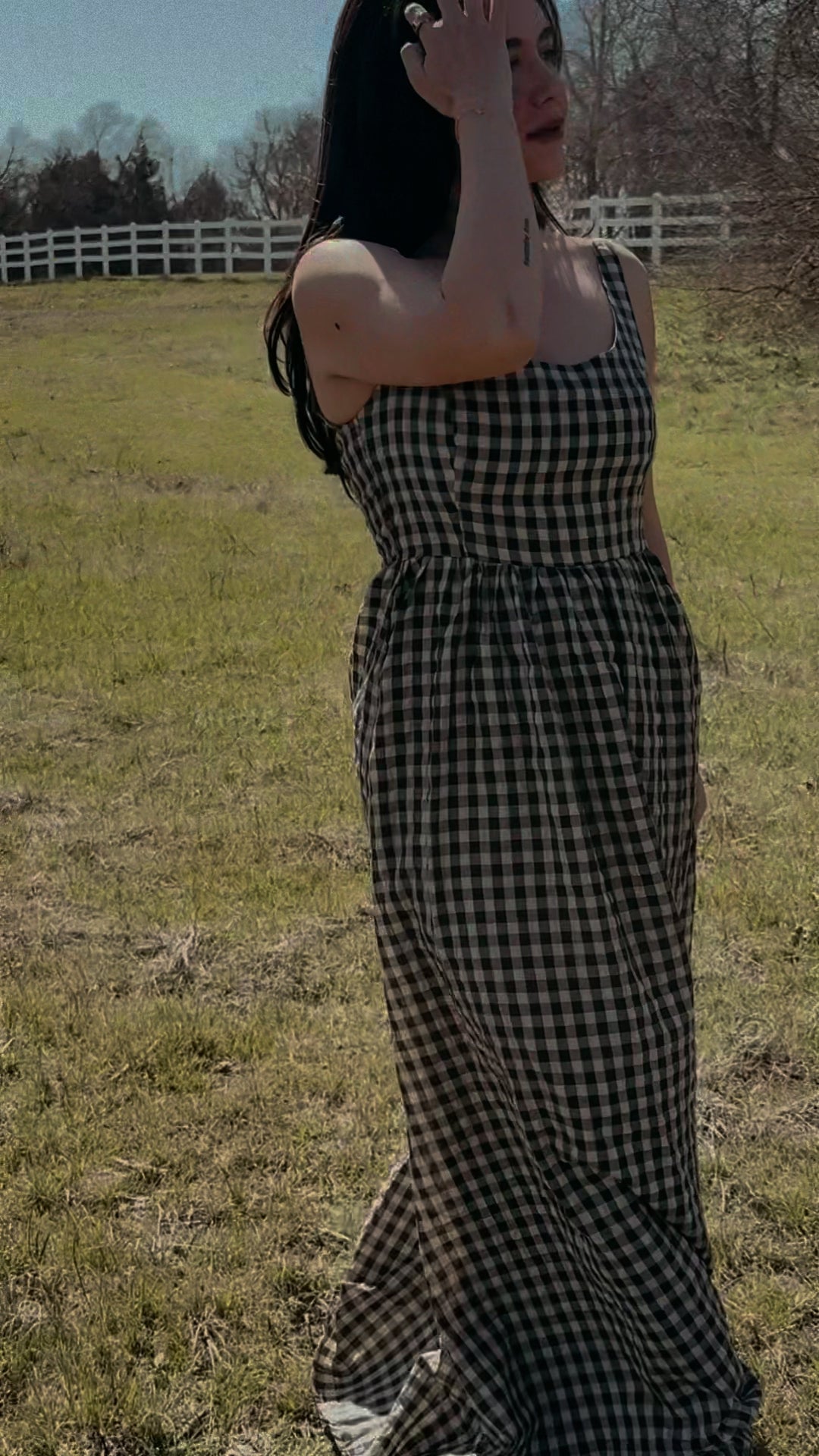 Our Belle Gingham dress is a tan and black checkered style maxi dress. Pair her with your best cowgirl boots and feel like a true cowgirl.