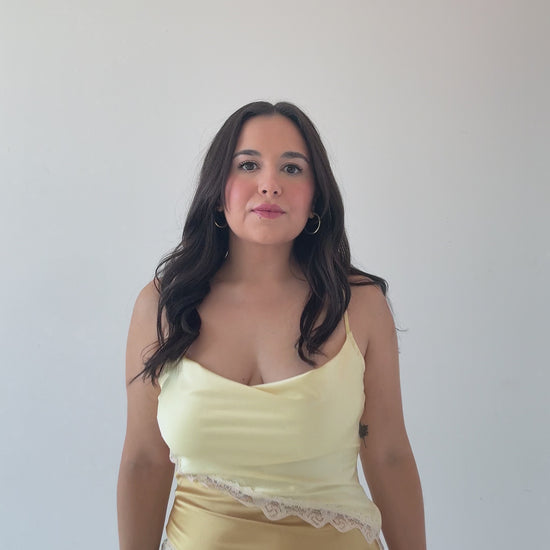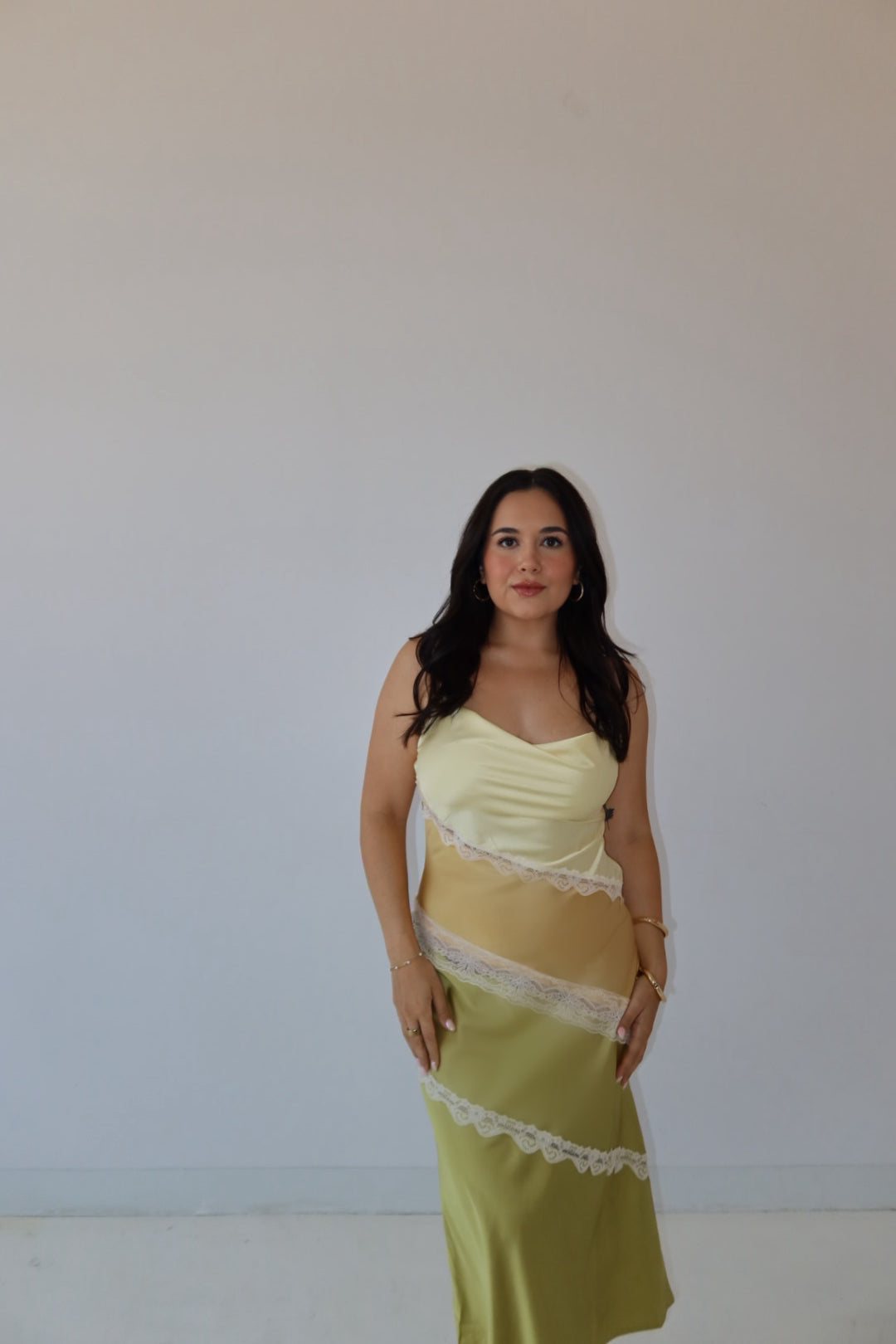 Our Limoncello Dress is a satin multi-color dress featuring a cowl neck, adjustable straps and gorgeous lace detailing. Pair her with your best kitten heels and a limoncello, duh.