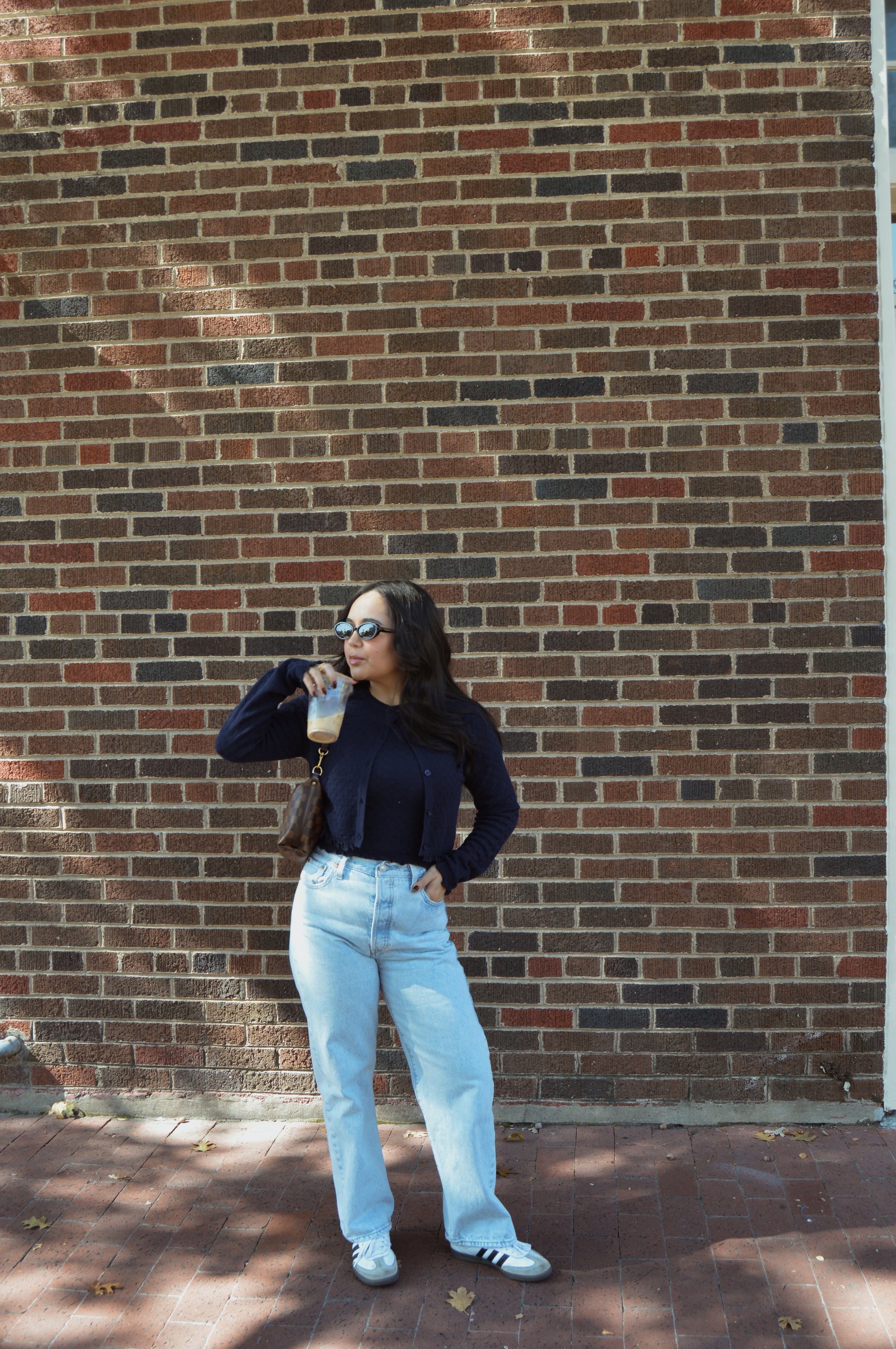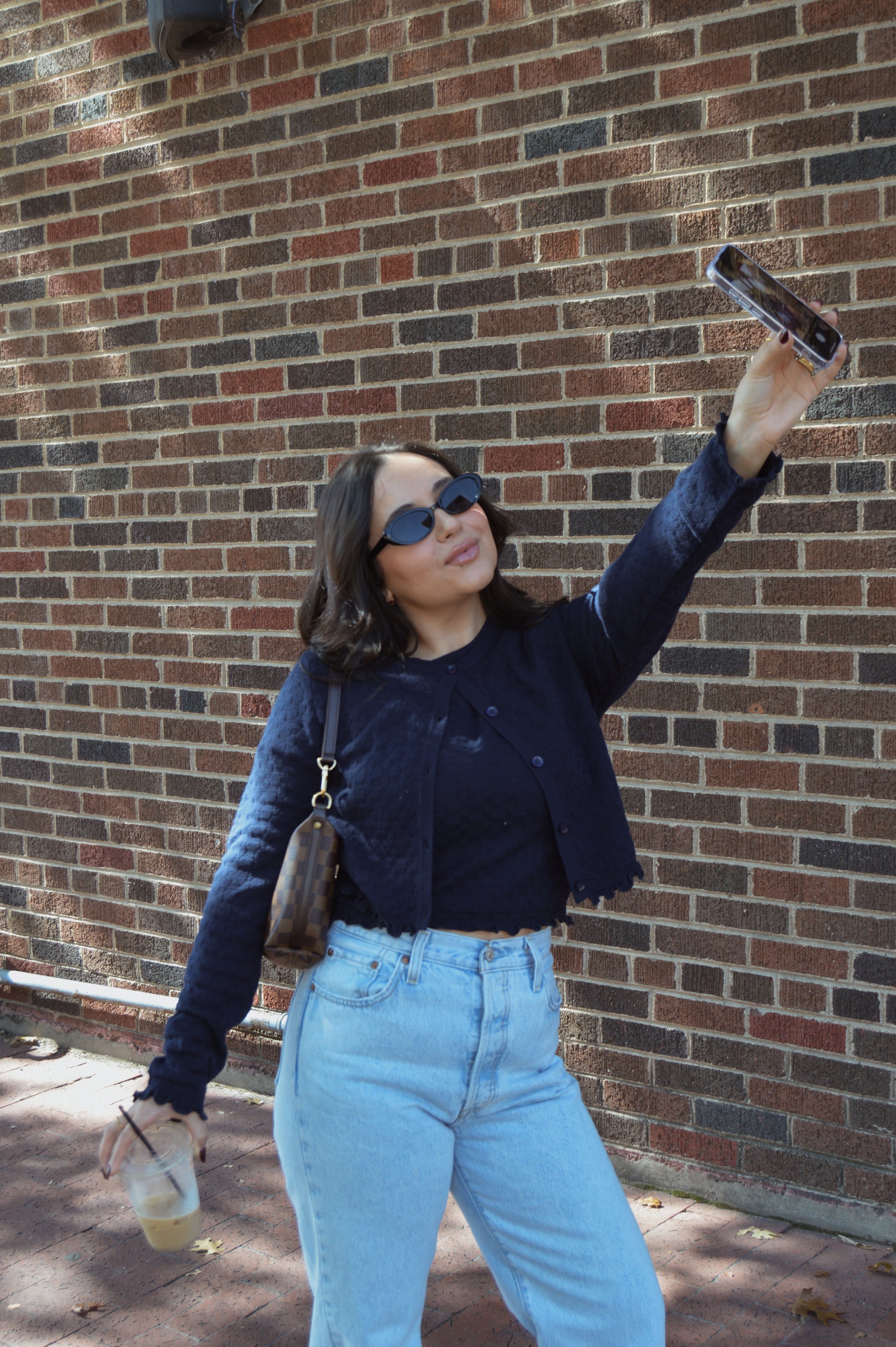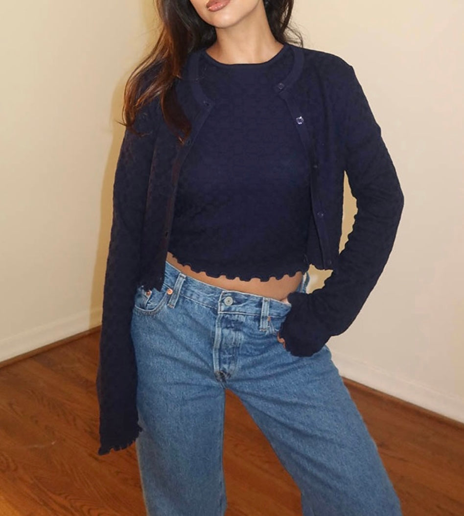 Our Lindsey Set is a two piece sweater set featuring a short sleeve top and a button-up cardigan. She is a gorgeous navy blue color with a unique pattern, and so soft! Style her separately or together. She's got you covered for all your day off errands.