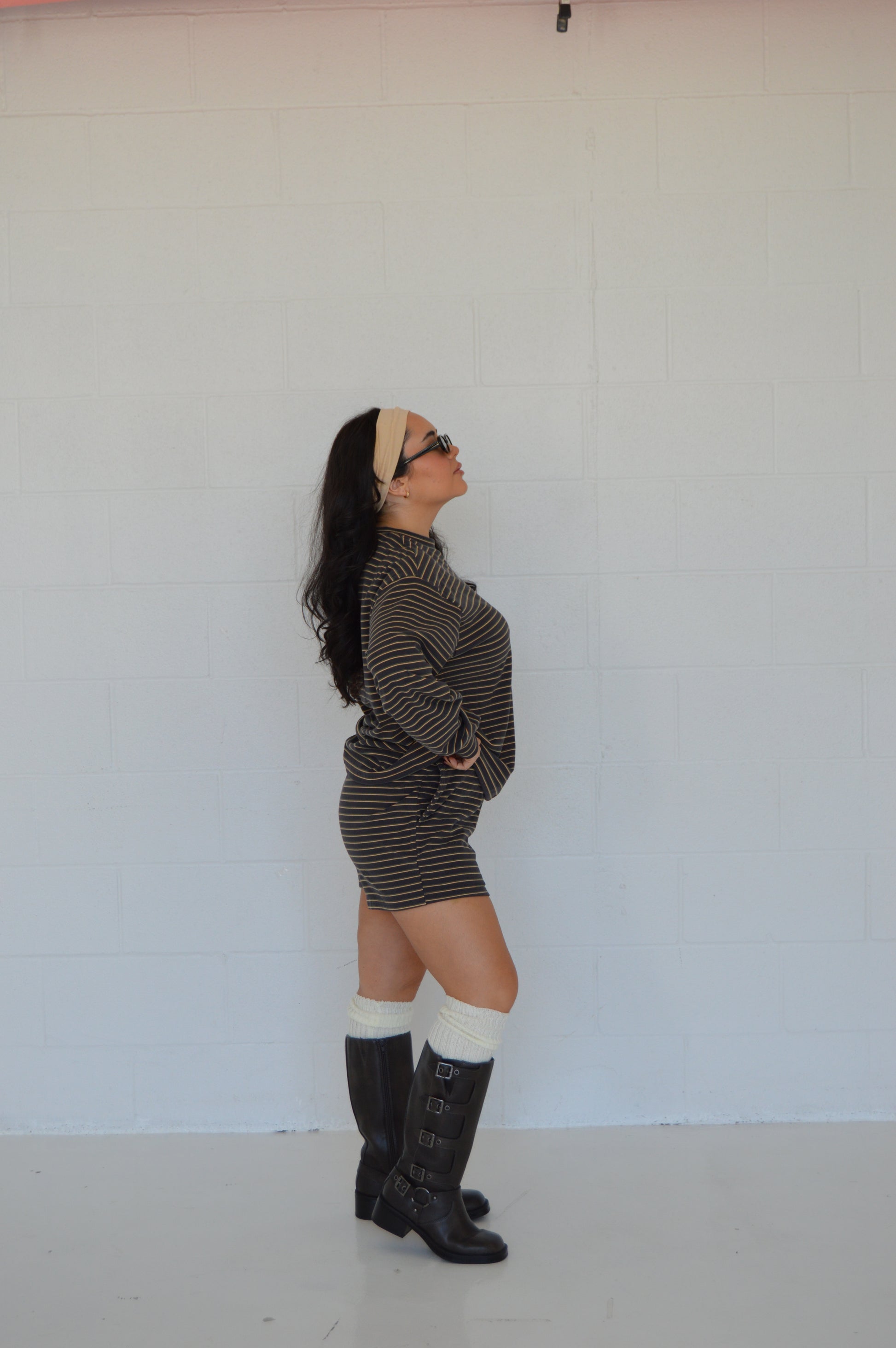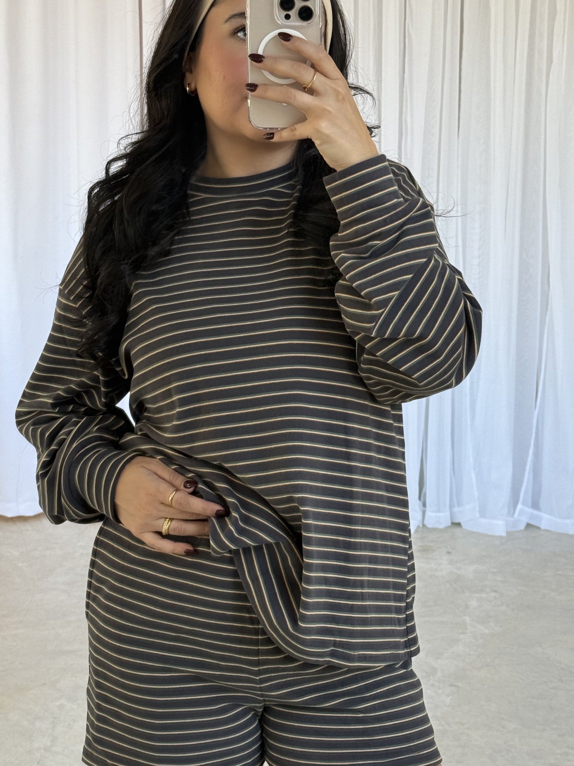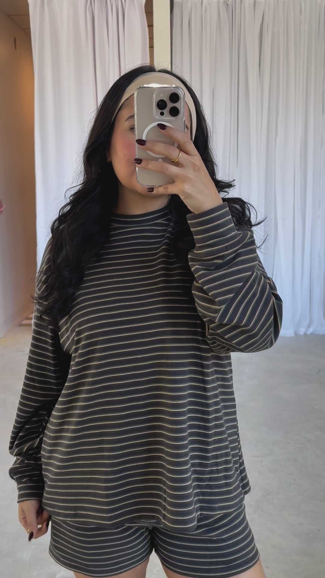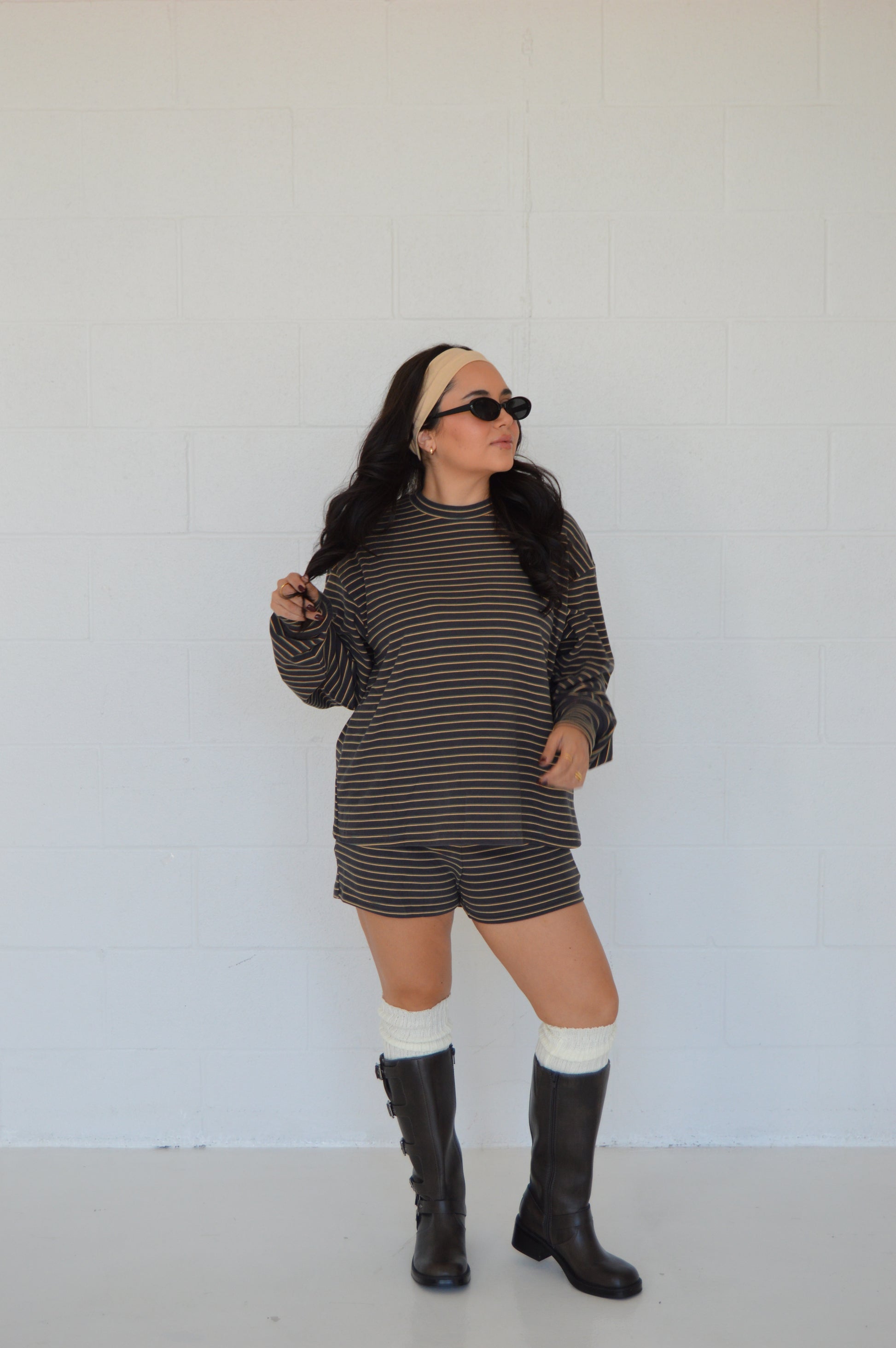 Our Night In Set is two-piece set featuring an oversized long sleeve and lounge shorts. It is the SOFTEST, most luxurious-feeling material. Pairs best with your night in plans.