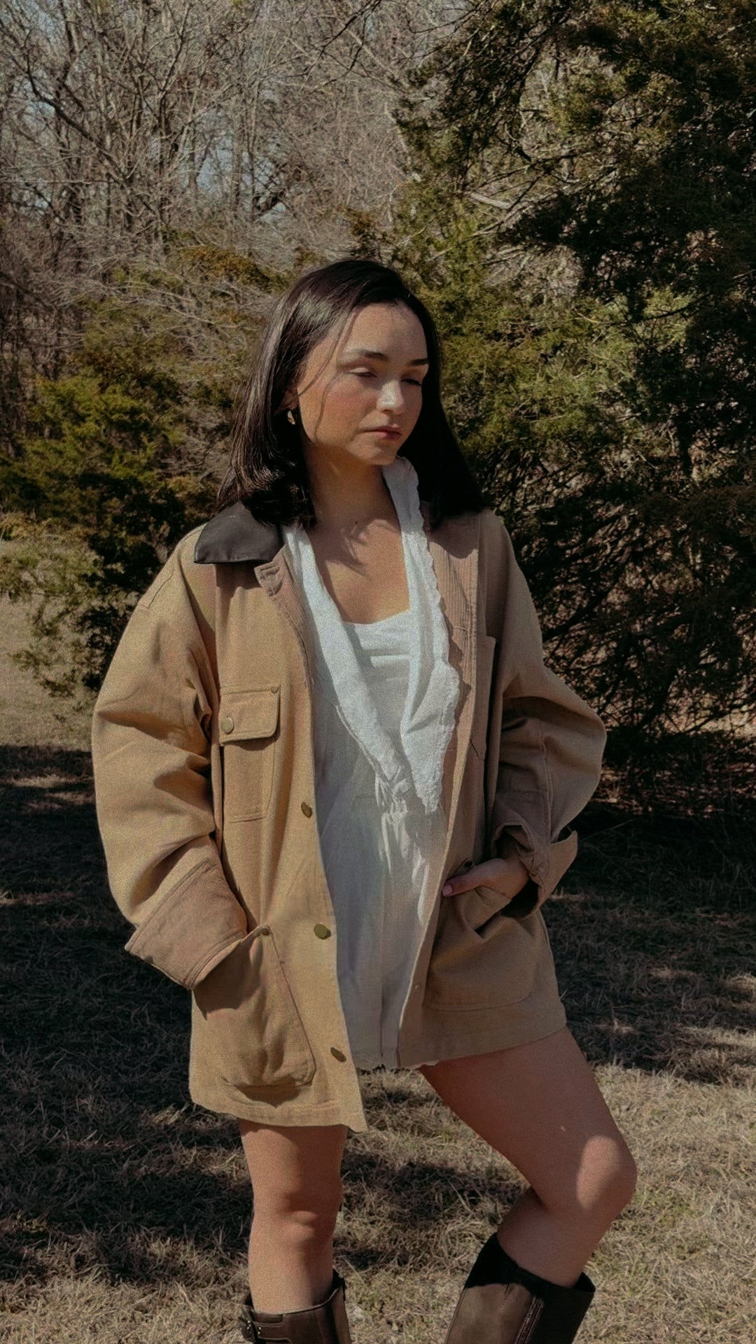 Our Oakley barn jacket is a gorgeous oversized chore-style jacket. She features a black leather collar, gold button details, and two pockets designed for being on the go. Pair her with literally anything.. she's versatile!