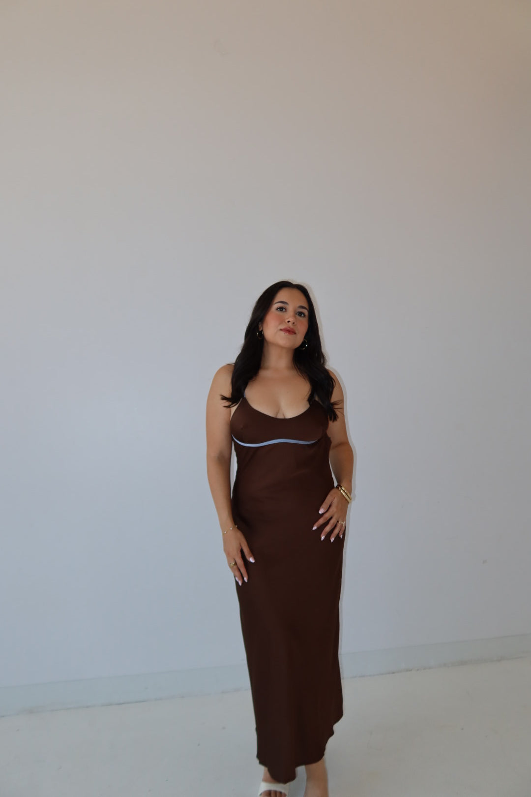 Our Riviera Dress is a chocolate brown satin midi dress with light blue detailing. She has adjustable straps and an open back and is absolutely stunning.